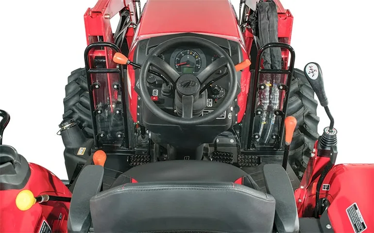 The operator platform features a near-flat floor, anti-slip rubber floor mat, and an adjustable seat with contoured cushions, armrests and a soft-coil suspension. Easy tractor access is provided by a two-step ladder. The power-assisted tilt-steering enhances control and reduces fatigue. The wide, flat fenders prevent mud sling and offer storage space.